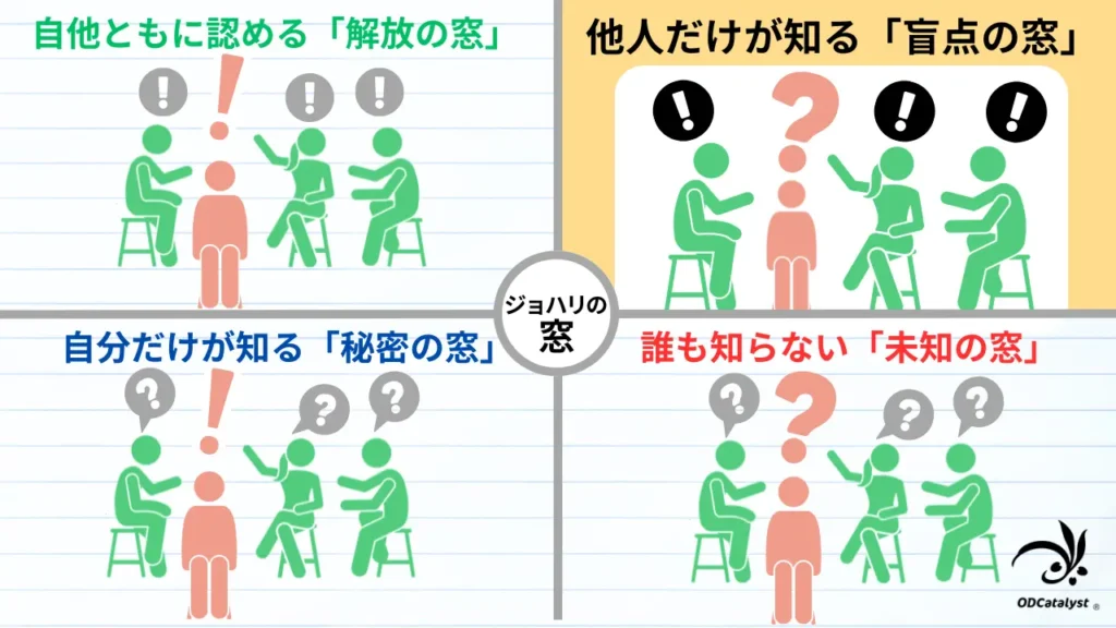 「他人には見えているが、自分では気づいていない領域(盲点)」です。(上図の右上に該当します)