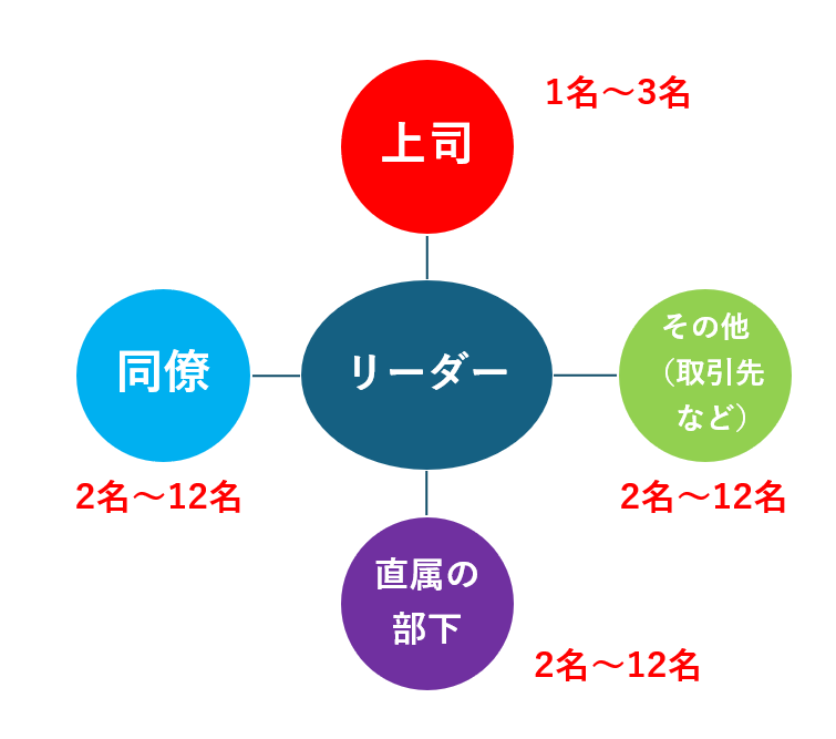 - 回答者が最大で39名まで可能。「上司」、「同僚」、「直属部下」、「その他(取引先など)」